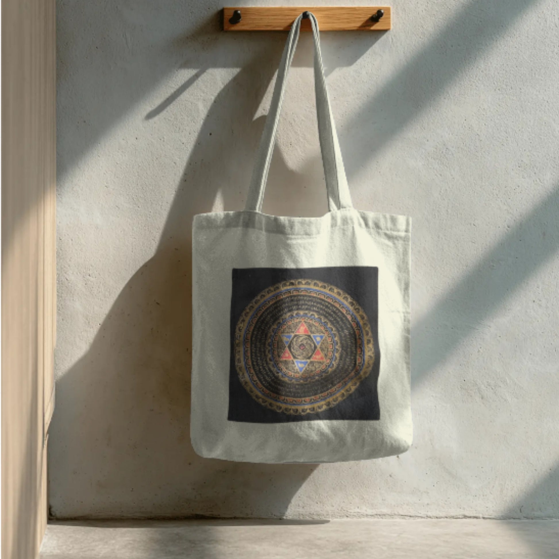 A serene beige tote crafted from 100% cotton, featuring an intricately hand-printed mandala design in earthy terracotta and ochre tones. Designed for mindful daily rituals, this ethically made bag blends ancient symbolism with contemporary utility, perfect for seekers, eco-shoppers, and advocates of intentional living.