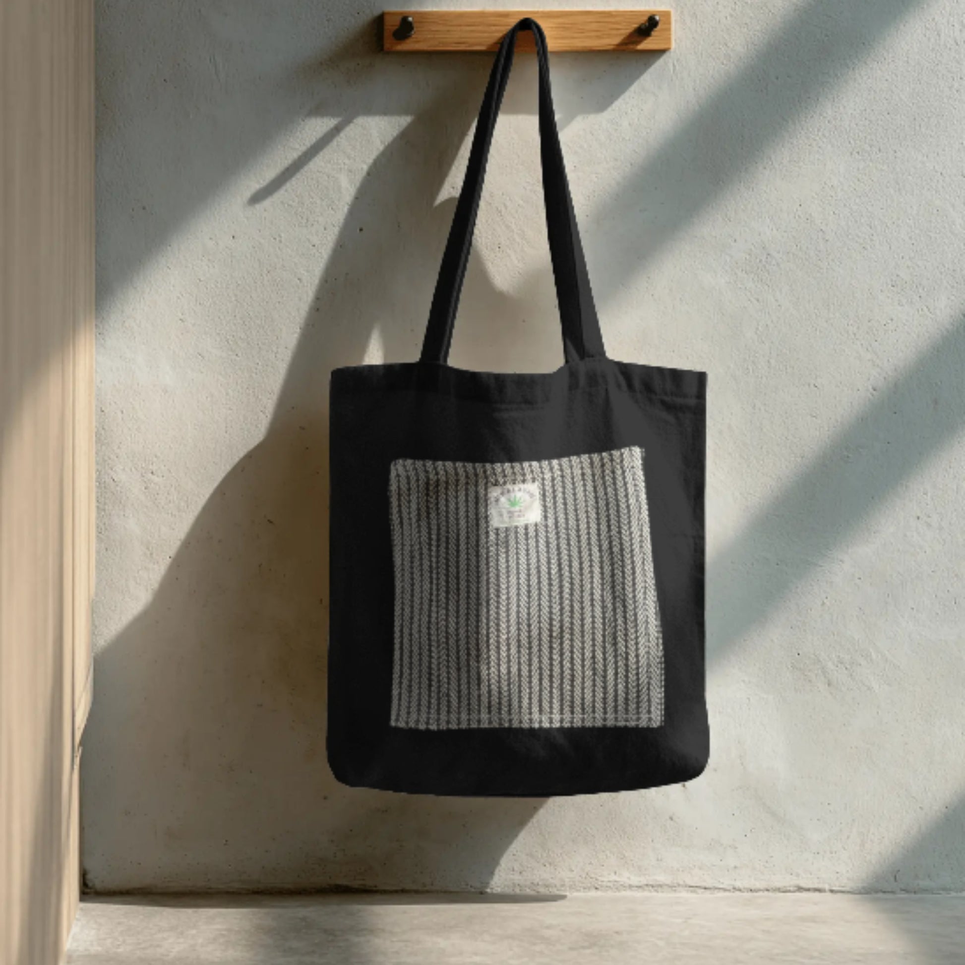 A timeless black tote crafted from 100% cotton, featuring minimalist striped detailing where the stripes cleverly form a functional front pocket. Designed for versatile daily use, this ethically made bag blends understated elegance with practical utility—perfect for professionals, commuters, and advocates of conscious simplicity.