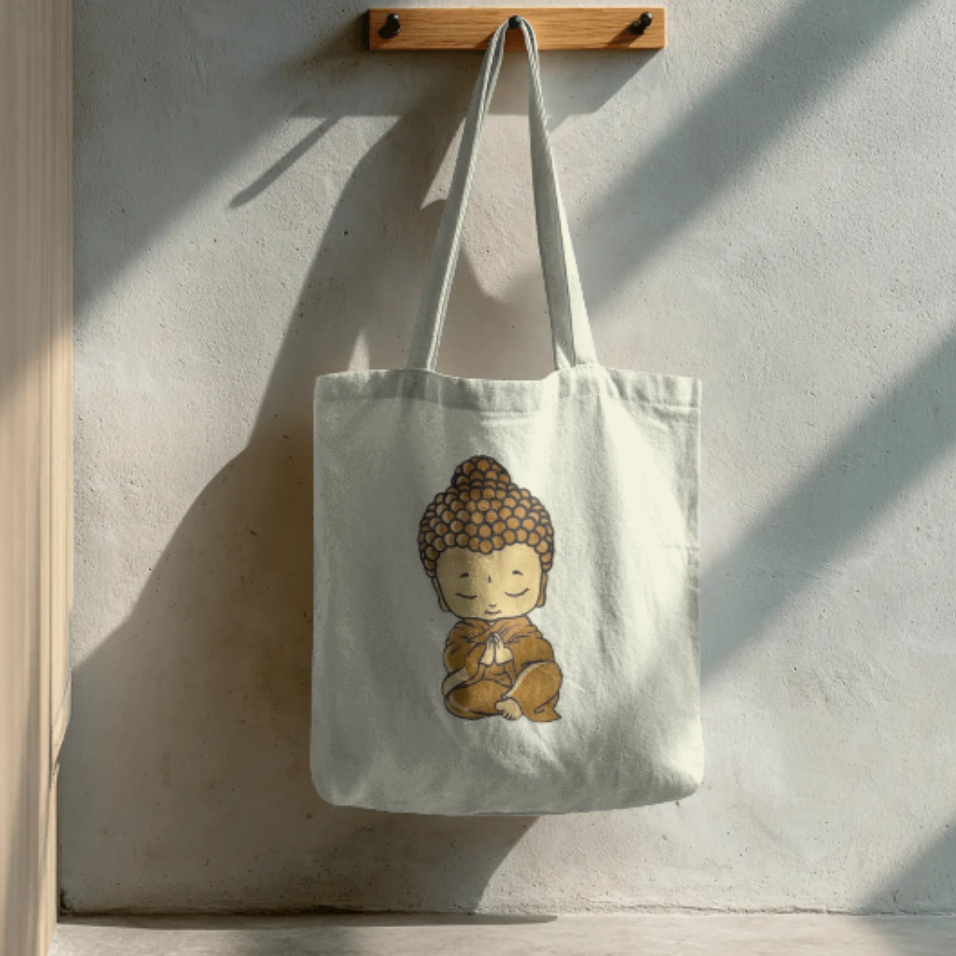A joyful yet meaningful tote crafted from 100% cotton, featuring a whimsical cartoon Buddha radiating positivity and lighthearted wisdom. Designed for uplifting daily use, this ethically made bag blends playful artistry with spiritual essence—perfect for free spirits, mindful adventurers, and advocates of happy living.