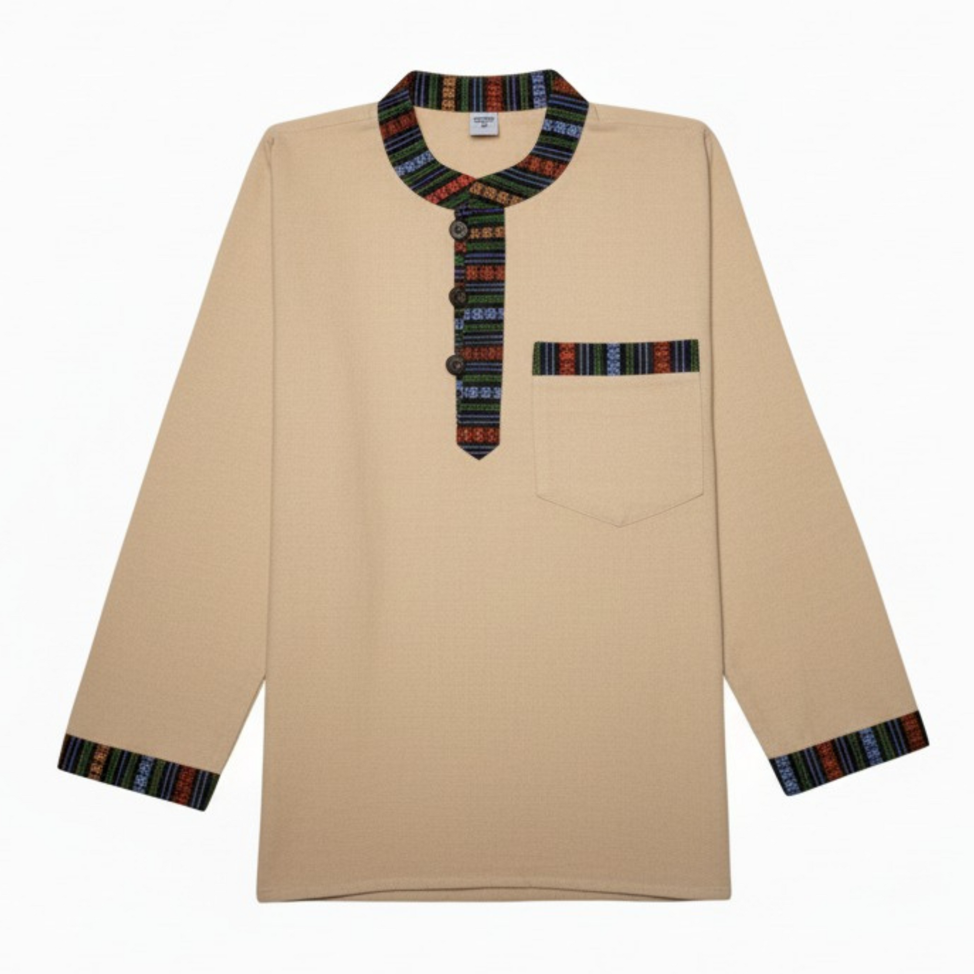 A seamless blend of contemporary minimalism and traditional artistry, this shirt is designed for those who appreciate subtle statements and meaningful design. With its clean silhouette, vibrant woven accents, and breathable cotton fabric, it’s a quiet celebration of cultural craftsmanship.