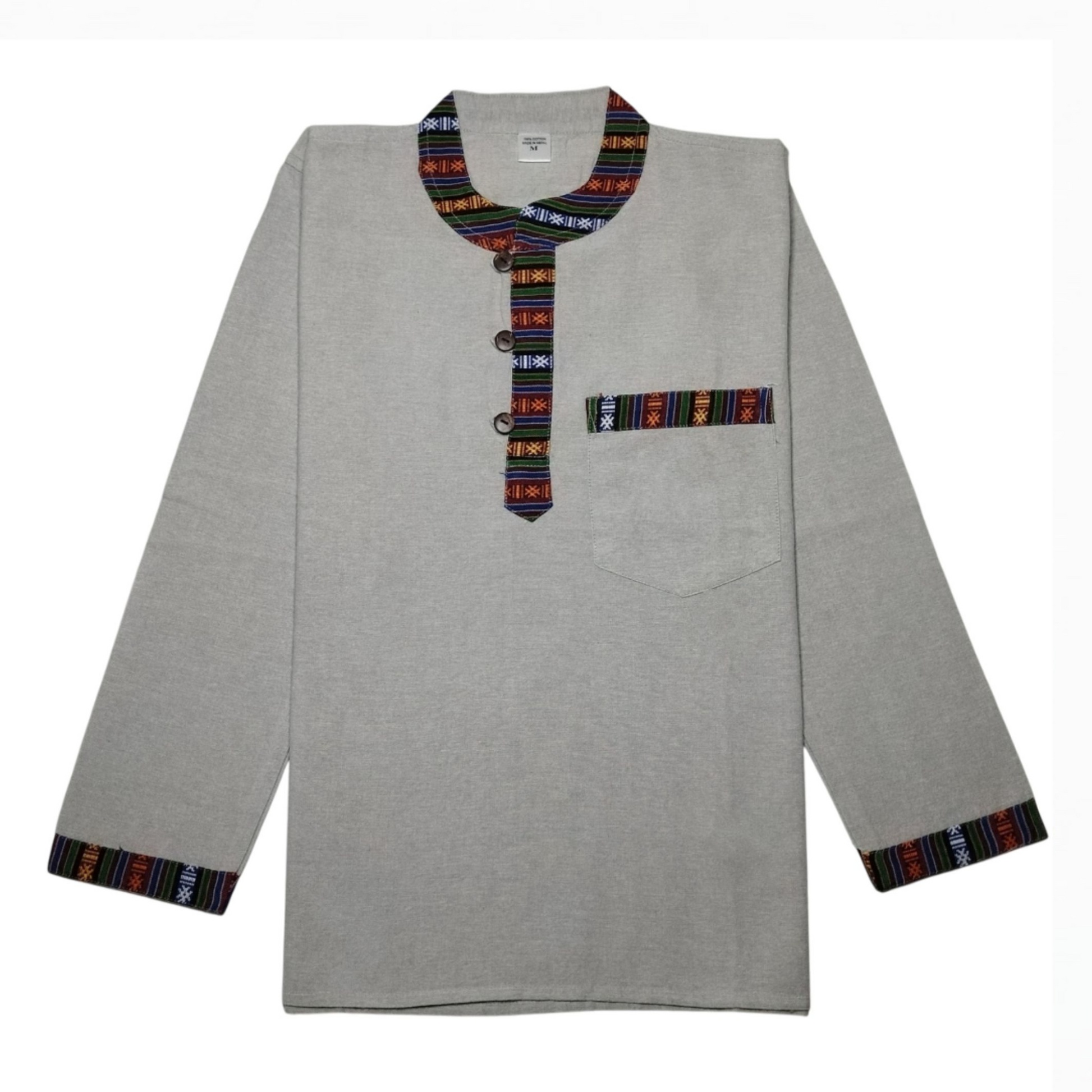 - Features intricate geometric patterns on the neckline, button placket, cuffs, and chest pocket edge.