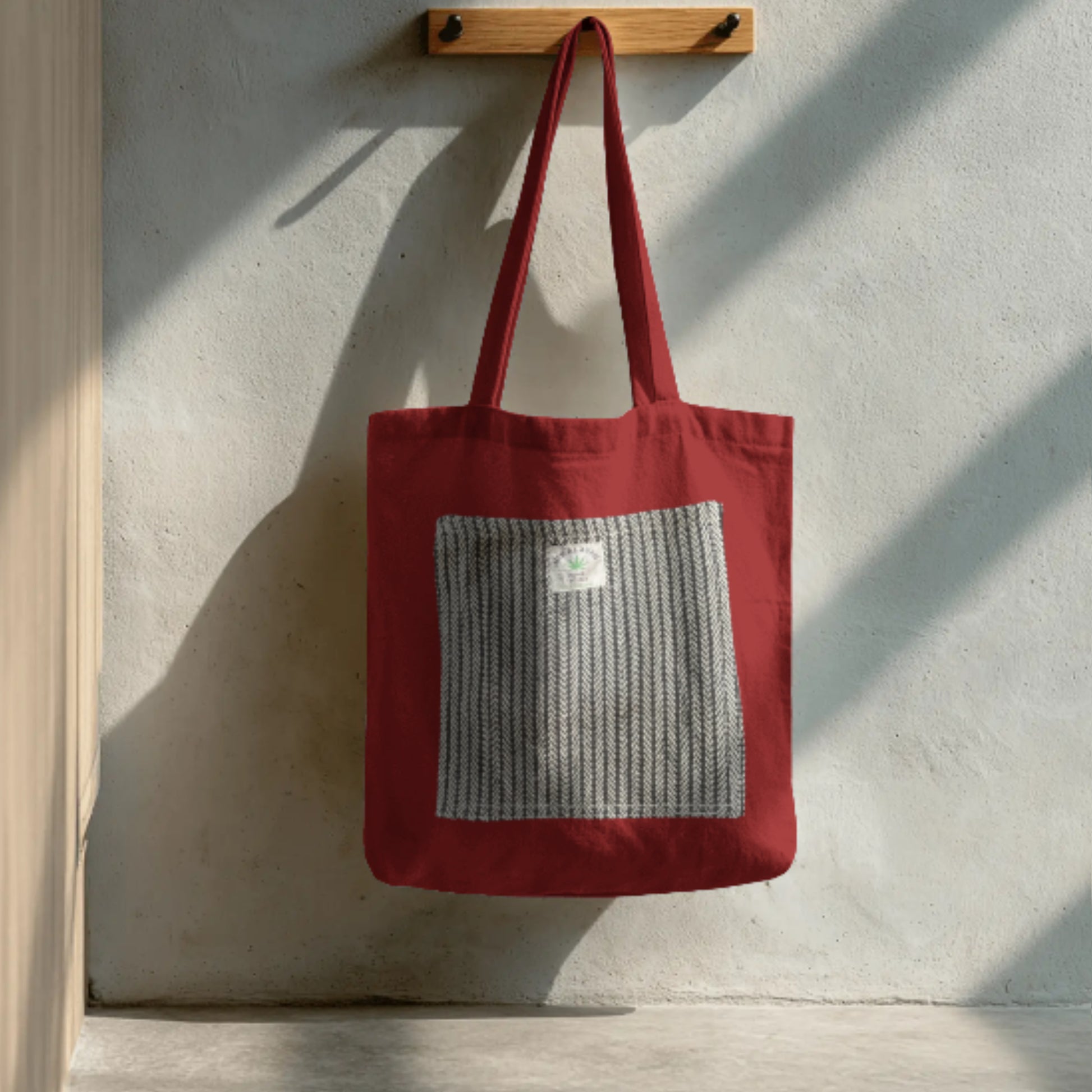 A rich maroon tote crafted from 100% cotton, featuring minimalist striped detailing where the stripes cleverly form a functional front pocket. Designed for stylish daily use, this ethically made bag blends contemporary design with practical utility—perfect for shoppers, commuters, and advocates of conscious simplicity.