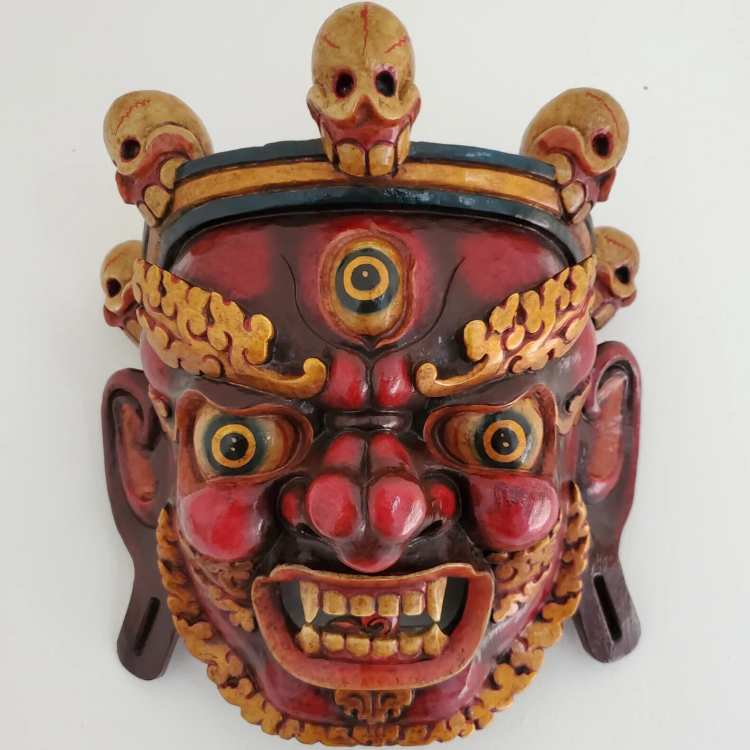 A powerful, intricately carved Bhairab deity mask handcrafted from seasoned Himalayan wood. Each piece is blessed by Nepali artisans using centuries-old techniques, making it a spiritually charged addition to sacred spaces or eclectic decor.