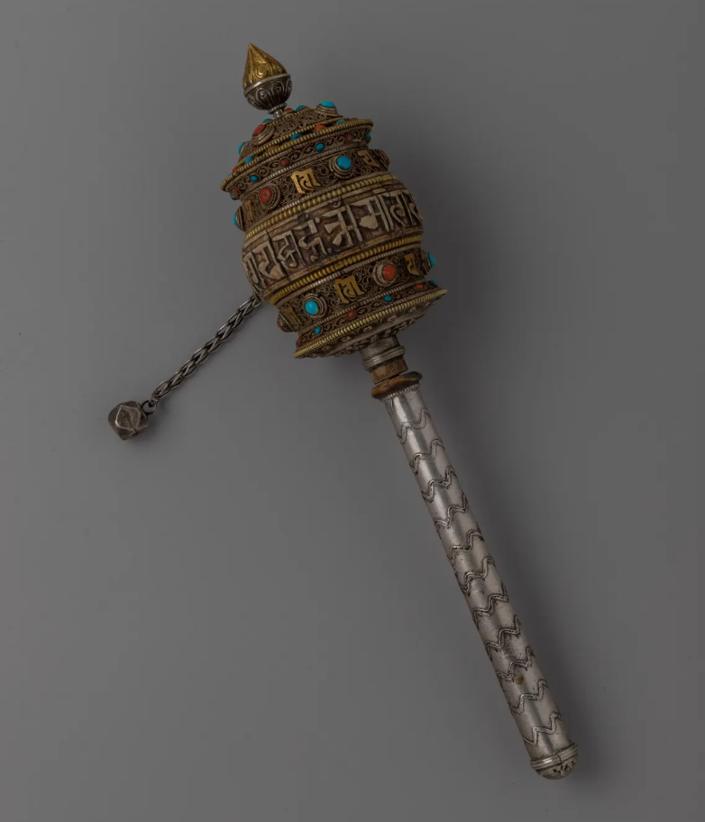 A traditional handheld prayer wheel meticulously crafted, containing the sacred Om Mani Padme Hum mantra. Spinning it clockwise generates spiritual merit, equivalent to reciting the mantra thousands of times. Adorned with semi-precious stones (turquoise, coral) and ethically sourced bone, this is both a devotional tool and a cultural masterpiece.