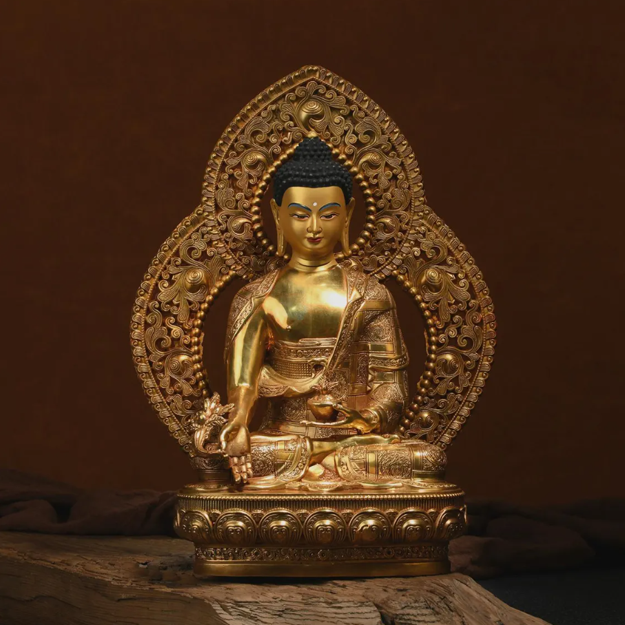 A venerable bronze statue of the Medicine Buddha (Bhaishajyaguru), crafted using traditional lost-wax techniques in Nepal. Aged 30-80 years, its patina and gentle wear marks testify to its history as a cherished ritual object. A powerful centerpiece for healing altars or mindful spaces.