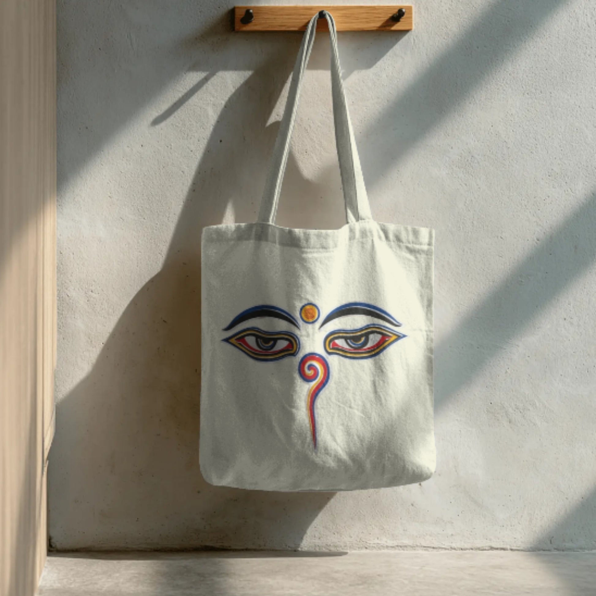 A serene yet meaningful tote crafted from 100% cotton, featuring Nepal’s iconic Buddha Eye (Wisdom Eyes) motif – symbolizing enlightenment, awareness, and divine protection. Designed for mindful daily use, this ethically made bag blends spiritual heritage with practical utility, perfect for seekers, shoppers, and advocates of conscious living.